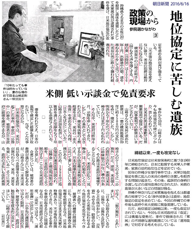 ▼横須賀の殺人事件では、遺族に対して補償金額を値切られ、以降の責任追及の放棄も求める米国。怒りしかない!(朝日新聞 2016年6月16日号より)