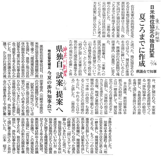 2月15日神奈川県議会での民進党滝田幸徳県議の代表質問で、日米地位協定に係る部分と知事の答弁要旨を紹介します。